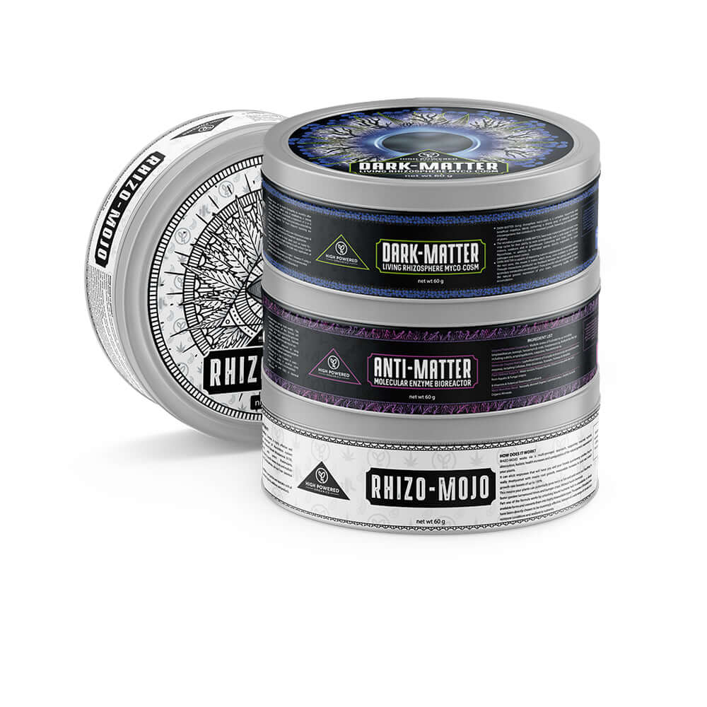 The GRO-BIOTICS Collection from High Powered Organics is a targeted range of microbial activators designed to energize and support living soil systems. ANTI-MATTER, DARK-MATTER, RHIZO-MOJO, and REPLICANT provides specialized biological tools to drive nutrient cycling, improve root colonization, and strengthen overall plant health.